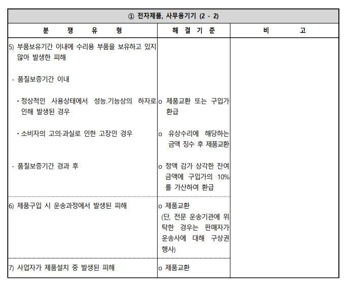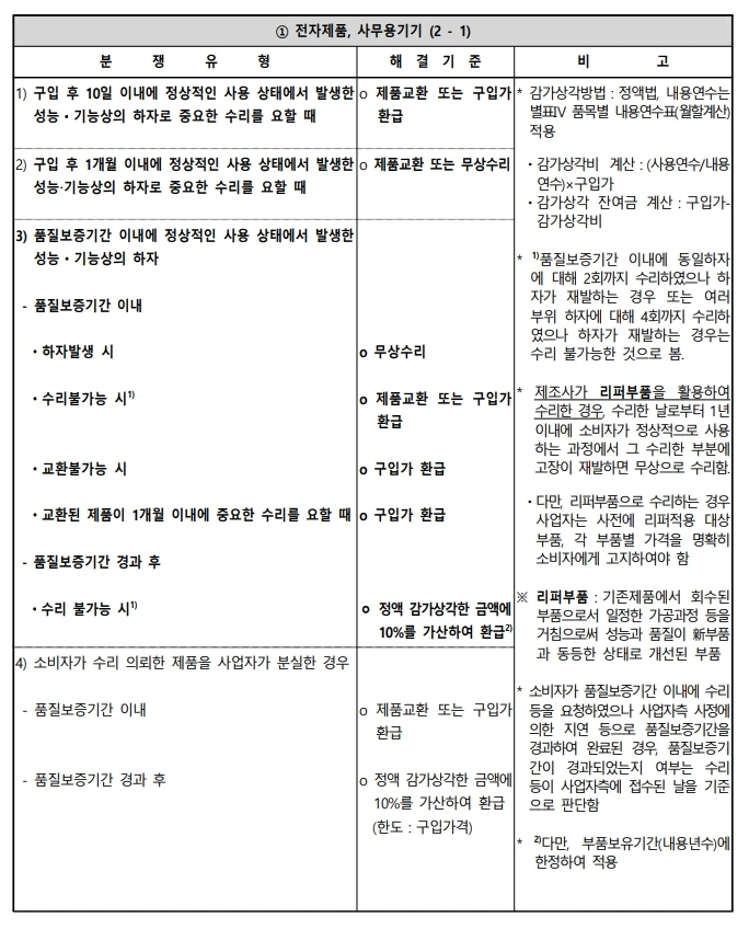 - 소비자분쟁해결기준: 품질보증 기간 내 하자 발생 시 교환·환급·무상수리 가능
