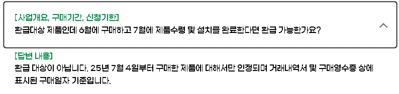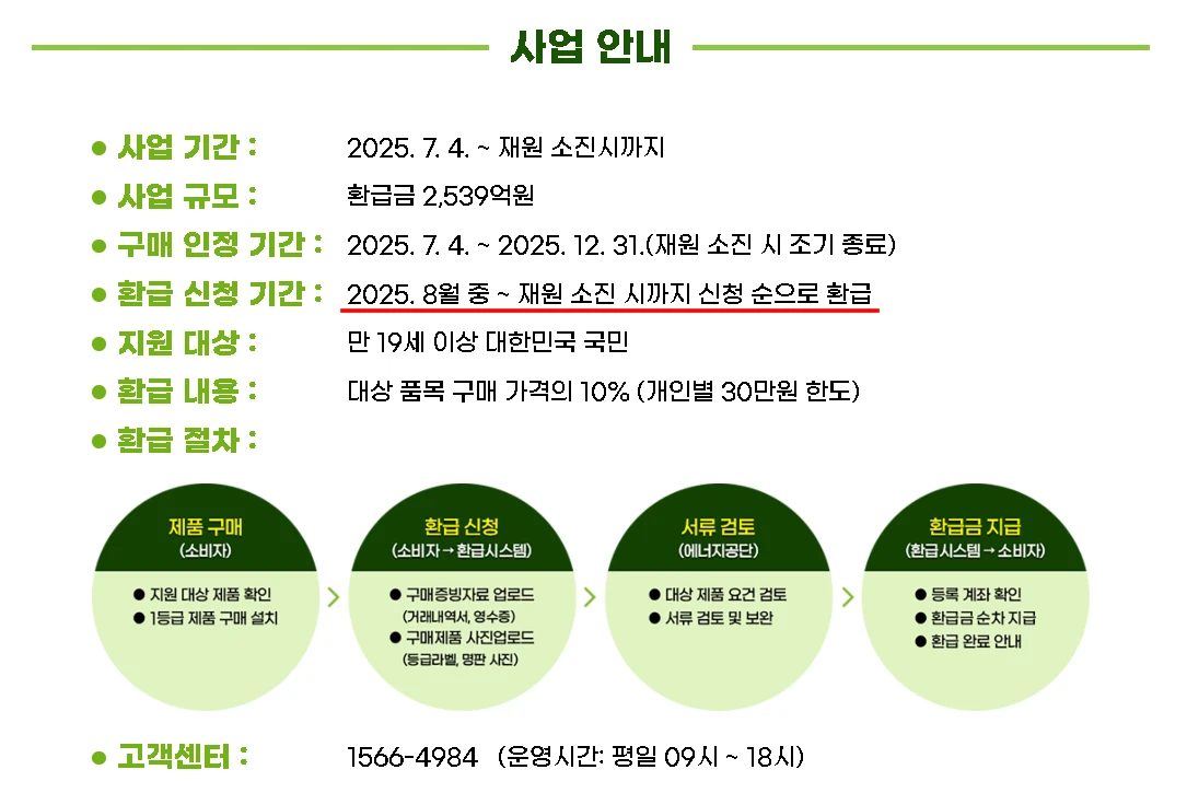 이번 으뜸효율 가전제품 환급사업은 2025년 7월 4일 이후 구매한 제품부터 해당됩니다. 그 이전에 구매한 제품은 안타깝게도 환급 대상이 아니니 유의해주세요. 예산이 소진되면 사업이 조기에 마감될 수 있으니, 구매를 망설이고 있다면 서두르는 것이 좋겠죠? 중고 제품이나 리퍼 제품은 지원 대상에서 제외되고, 반드시 새 제품에 한해 지원 가능합니다.