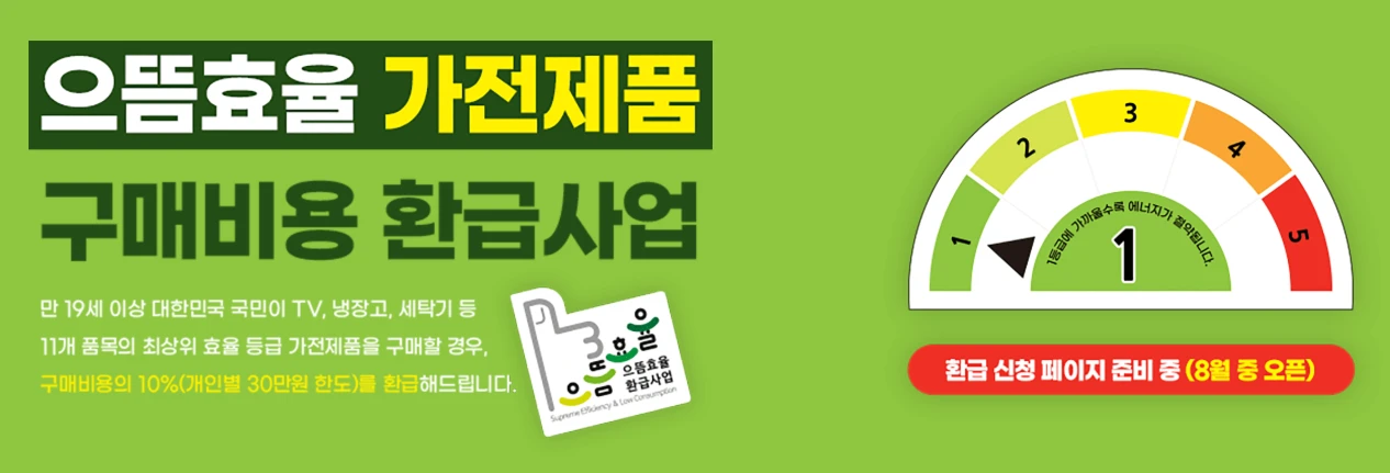 만 19세 이상 대한민국 국민이 TV, 냉장고, 세탁기 등 11개 품목의 최상위 효율 등급 가전제품을 구매할 경우, 구매비용의 10%(개인별 30만원 한도)를 환급해드립니다.